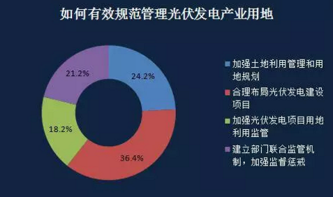 此次調(diào)查中,占受訪者比例最高的為合理布局光伏發(fā)電建設(shè)項(xiàng)目,為36.4%。有受訪者表示,在光伏電站中變電站及運(yùn)行管理中心、集電線路、場(chǎng)內(nèi)道路等光伏發(fā)電建設(shè)項(xiàng)目規(guī)劃時(shí),要優(yōu)先考慮可以使用未利用的土地,有效避開(kāi)永久基本農(nóng)田等非建設(shè)用地。