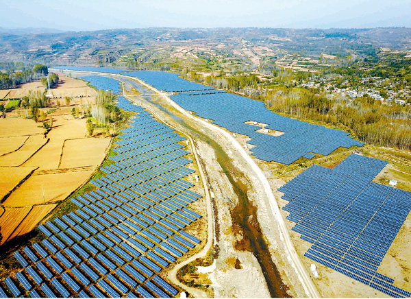 近日,在洛寧縣東宋鎮(zhèn)中建材農(nóng)光互補(bǔ)項(xiàng)目現(xiàn)場(chǎng),無(wú)人機(jī)鏡頭下的連片光伏板熠熠生輝! ≡擁(xiàng)目利用該鎮(zhèn)渡陽(yáng)河北岸的1200畝荒灘地,建設(shè)36兆瓦地面分布式光伏電站,其中還建設(shè)有20座農(nóng)光互補(bǔ)光伏大棚,利用太陽(yáng)能光伏板組件間隙空地,種植油用牡丹等高效經(jīng)濟(jì)作物,可帶動(dòng)十余戶貧困戶脫貧增收。(李峰 攝)
