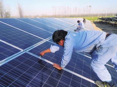 11月1日,技術(shù)人員在固始縣徐集鄉(xiāng)趙崗村安裝光伏發(fā)電板。該縣總投資4.38億元,在全縣146個(gè)貧困村每村興建了一處不少于6670平方米的光伏發(fā)電基地。這些光伏發(fā)電基地建成并網(wǎng)后,不僅可以緩解當(dāng)?shù)厝罕娚a(chǎn)生活高峰用電難,而且還可增加當(dāng)?shù)刎毨丝谑杖,深受群眾歡迎。