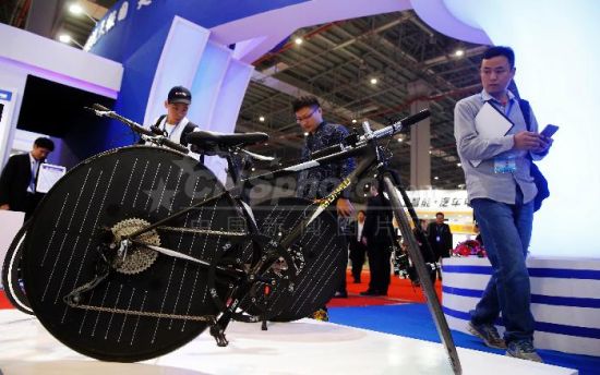 11月7日,以“創(chuàng)新、智能、綠色”為主題的第十九屆中國國際工業(yè)博覽會在上海舉行。本次展會規(guī)模超28萬平方米,中外參展商逾2500家,展商數(shù)量再創(chuàng)歷史新高。圖為:太陽能自行車亮相工博會引人關(guān)注。