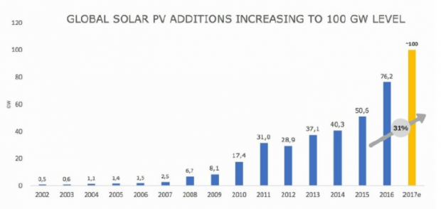 SolarPower Europe表示,隨著全球市場需求量達到100GW, 2016年內(nèi)的安裝量為76.6GW,2017年的年度增長幅度將超過30%。