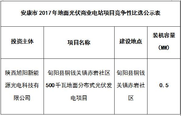 原標(biāo)題:安康市2017年地面光伏商業(yè)電站項(xiàng)目競爭性比選結(jié)果公示