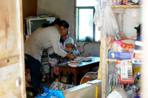 (“懸崖村”上村民在吃飯,屋內(nèi)擺設(shè)相對簡單,身后有一彩電,有了電,村民生活較以往也豐富起來。)