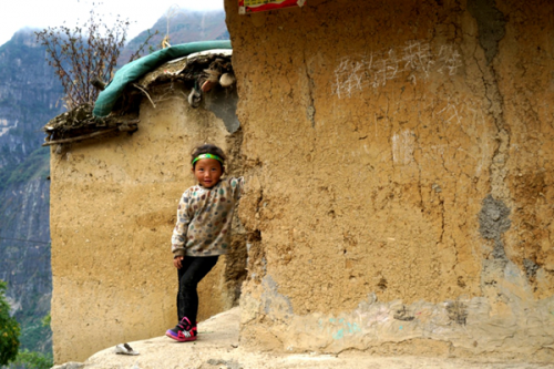 (“懸崖村”里的小女孩,好奇而又靦腆的看著來訪的“不速之客”,一臉的天真無邪。)