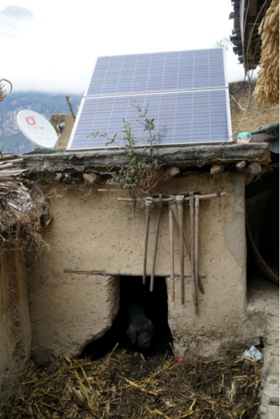 (一戶“懸崖村”村民豬圈上裝的光伏電站,高山之上開辟的“牧光結(jié)合”光伏應(yīng)用模式。光伏面板前方是有線電視接收器,村民有時用光伏發(fā)電來滿足生活所需,其中包括看電視等。)