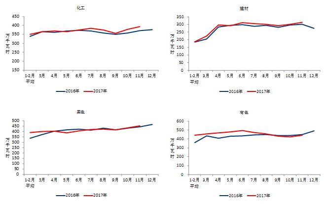 1-11月份,化學原料制品、非金屬礦物制品、黑色金屬冶煉和有色金屬冶煉四大高載能行業(yè)用電量合計16565億千瓦時,同比增長4.3%,增速比上年同期提高5.2個百分點;合計用電量占全社會用電量的比重為28.9%,對全社會用電量增長的貢獻率為19.7%。其中,化工行業(yè)用電量4057億千瓦時,同比增長4.4%,增速比上年同期提高3.2個百分點;建材行業(yè)用電量3016億千瓦時,同比增長3.6%,增速比上年同期提高1.2個百分點;黑色金屬冶煉行業(yè)用電量4497億千瓦時,同比增長1.4%,增速比上年同期提高6.4個百分點;有色金屬冶煉行業(yè)4994億千瓦時,同比增長7.5%,增速比上年同期提高8.0個百分點。