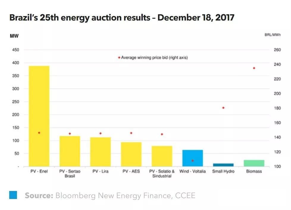 12月18日,巴西舉行了該國2017年的首輪逆向拍賣。本輪拍賣中的供電協(xié)議覆蓋多種發(fā)電技術(shù):生物質(zhì)、小型水電、風(fēng)電和光伏等多種發(fā)電項(xiàng)目。過去2年中,巴西電力拍賣市場一直死氣沉沉,本輪拍賣敲定的891MW項(xiàng)目終于散發(fā)出積極的市場信號。 具體來看,光伏在本輪拍賣中大獲全勝,共敲定了791MW的合同,平均成交價為1
