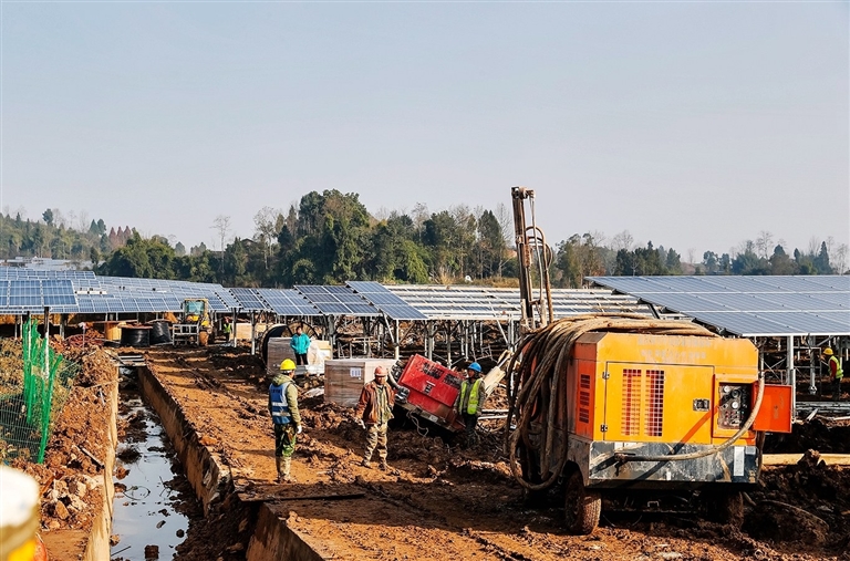近日,馬灌鎮(zhèn)雙石村,工人在安裝晶體硅光伏組件(記者 余鴻 攝 )