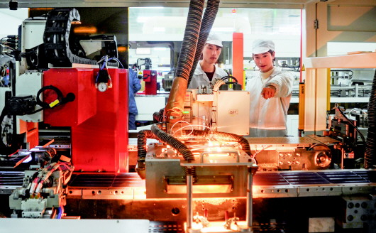 1月18日,該公司生產(chǎn)車間里,工人們正在操作智能化生產(chǎn)設備 貴安新區(qū)亞瑪頓光電材料公司擁有500MW智能化超薄雙玻組件生產(chǎn)項目(“千企引進”項目),并搭建3條智能化超薄雙玻太陽能組件、2條物理氣浮式超薄鋼化玻璃等生產(chǎn)線,所生產(chǎn)的產(chǎn)品是該廠首創(chuàng)的智能化超薄雙光伏組件,擁有全球獨一無二的超薄玻