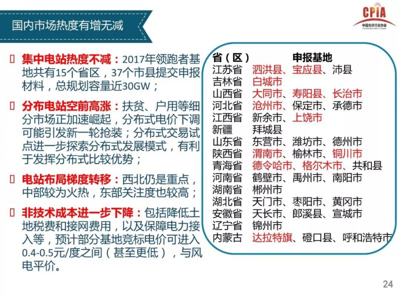 2018年1月24日,中國光伏行業(yè)協(xié)會(huì)主辦的光伏行業(yè)2017年回顧與2018年展望研討會(huì)在京召開。中國光伏行業(yè)協(xié)會(huì)秘書長王勃華總結(jié)了從多晶硅、硅片、電池片、組件、逆變器到下游戶用光伏、分布式光伏、領(lǐng)跑者項(xiàng)目以及集中式光伏的發(fā)展情況,同時(shí)對(duì)2018年的發(fā)展前景進(jìn)行了預(yù)測(cè)。中國光伏行業(yè)協(xié)會(huì) 副理事長兼秘書長2017年全年行業(yè)
