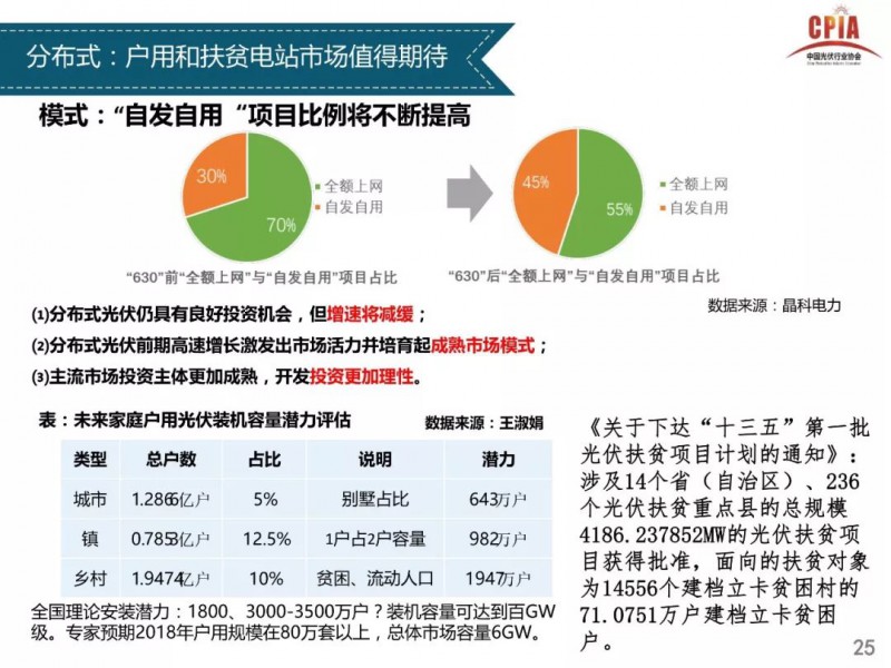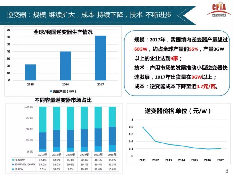 2018年1月24日,中國光伏行業(yè)協(xié)會(huì)主辦的光伏行業(yè)2017年回顧與2018年展望研討會(huì)在京召開。中國光伏行業(yè)協(xié)會(huì)秘書長王勃華總結(jié)了從多晶硅、硅片、電池片、組件、逆變器到下游戶用光伏、分布式光伏、領(lǐng)跑者項(xiàng)目以及集中式光伏的發(fā)展情況,同時(shí)對(duì)2018年的發(fā)展前景進(jìn)行了預(yù)測(cè)。