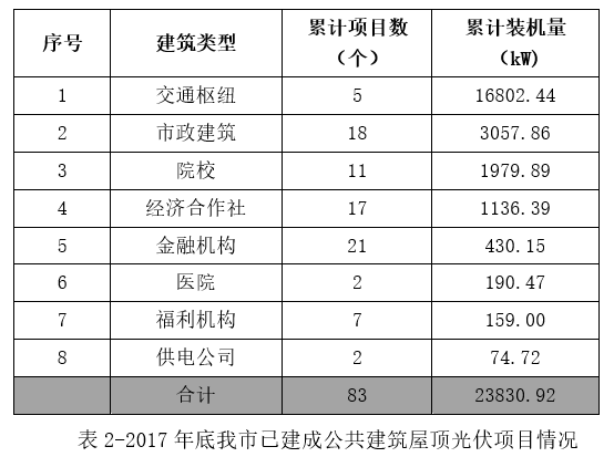 近兩年,屋頂分布式光伏已逐步應(yīng)用到杭州黨政機關(guān)、學(xué)校、醫(yī)院、火車站、機場、養(yǎng)老院、銀行等多個公共機構(gòu)。如表2所示,截至2017年底,全市已安裝公共建筑屋頂分布式光伏應(yīng)用項目(不含產(chǎn)業(yè)園區(qū)、工業(yè)園區(qū)及商業(yè)建筑)共83個,累計裝機容量23.83MW。2017年,杭州火車南站、市民中心、經(jīng)開區(qū)管委會以及位于桐廬、淳安的鎮(zhèn)政府等公共機構(gòu)屋頂相繼裝上光伏發(fā)電系統(tǒng),為促進(jìn)“節(jié)能減排、低碳杭州”的建設(shè),起到了良好的標(biāo)桿示范作用。