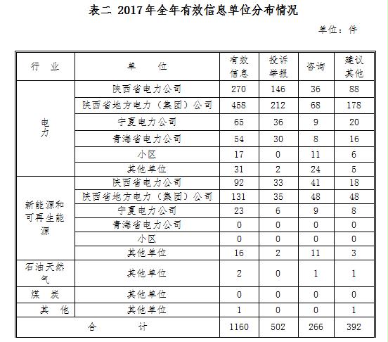 2017年1月1日至12月31日,陜、寧、青三省(區(qū))共收到有效事項(xiàng)1160件。其中:投訴487件,舉報(bào)15件,咨詢267件,表揚(yáng)、求助、建議等其他方面391件。