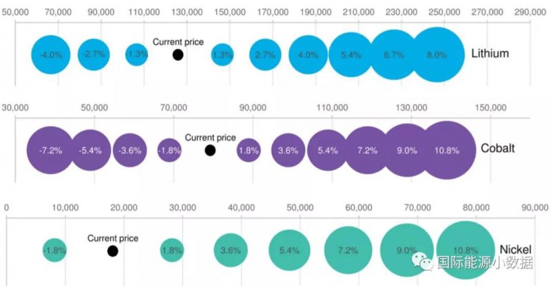 如下圖所示,以鋰材料為例,目前價(jià)格低于13萬(wàn)美元/噸,如果這一價(jià)格加倍達(dá)到25萬(wàn)美元/噸,那么電池成本僅上升8%。同樣,如果鈷的價(jià)格從8萬(wàn)美元/噸升至14萬(wàn)美元/噸,電池成本上升10.8%。如果鎳的價(jià)格從2萬(wàn)美元/噸上升至8萬(wàn)美元/噸,那么電池成本上升10.8%。
