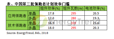 中國國家能源局日前正式公布2017年度(第三批)領跑者計劃的基地安排、基地規(guī)模與后續(xù)落實計劃的時間表,預計2018年底將有5GW的應用領跑者計劃并網,而1.5GW的技術領跑者則被要求在2019年6月30日并網。由于技術領跑者鼓勵尚未量產化的多元技術,且競標配分最高者為先進技術指標,這些措施都為新一代電池技術帶來了曙光。