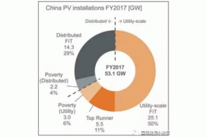 國外業(yè)界對(duì)于2017年中國2017年新增光伏超過53吉瓦稱羨不已。根據(jù)中國能源局發(fā)布的數(shù)據(jù),2017年中國新增53.1吉瓦,其中大型地面光伏電站25.1吉瓦(占50%),分布式光伏14.3吉瓦(29%),集中式光伏扶貧3.0吉瓦(6%),分布式光伏扶貧2.2吉瓦(4%),領(lǐng)跑者計(jì)劃5.5吉瓦(11%)。