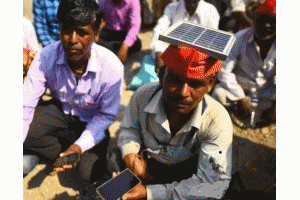一名印度男子頭頂太陽(yáng)能電池板,來(lái)為手機(jī)充電