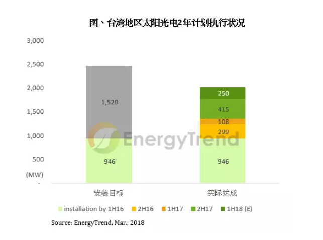 臺(tái)灣地區(qū)在2016年7月啟動(dòng)的“太陽光電2年推動(dòng)計(jì)劃”即將于2018年6月到期,目標(biāo)是在兩年期間新增1,520MW光伏并網(wǎng)量。但集邦咨詢旗下新能源研究中心集邦新能源網(wǎng)EnergyTrend指出,2年計(jì)劃期間的新增并網(wǎng)量預(yù)估僅1,072MW,整體執(zhí)行率約71%,恐無法順利達(dá)標(biāo)。