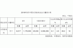 據(jù)中國(guó)海關(guān)數(shù)據(jù)統(tǒng)計(jì),2018年3月中國(guó)太陽(yáng)能電池出口量統(tǒng)計(jì)如下: