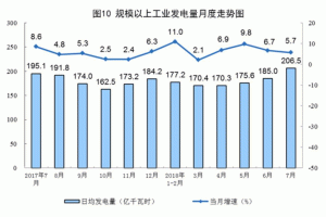 7月份,全國(guó)平均氣溫較常年同期偏高1℃,甘肅、湖北、吉林、遼寧、山東等地多發(fā)極端高溫天氣。受工業(yè)用電需求旺盛和持續(xù)高溫影響,發(fā)電量迅速攀升,7月份發(fā)電6400.2億千瓦時(shí),同比增長(zhǎng)5.7%;日均發(fā)電206.5億千瓦時(shí),比上月增加21.5億千瓦時(shí),創(chuàng)歷史新高。1-7月份,發(fā)電量同比增長(zhǎng)7.8%,比去年同期加快1.0個(gè)百分點(diǎn)。