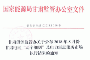 甘肅能源監(jiān)管辦關(guān)于公布2018年8月份甘肅電網(wǎng)“兩個細則”及電力輔助服務(wù)市場執(zhí)行結(jié)果的通知