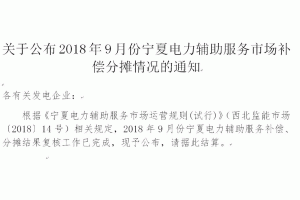 關(guān)于公布2018年9月份寧夏電力輔助服務(wù)市場(chǎng)補(bǔ)償分?jǐn)偳闆r的通知
