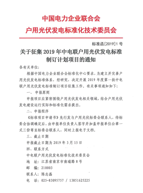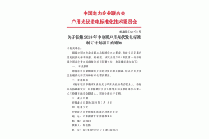 關(guān)于征集2019年中電聯(lián)戶用光伏發(fā)電標(biāo)準(zhǔn)制訂計劃項目的通知