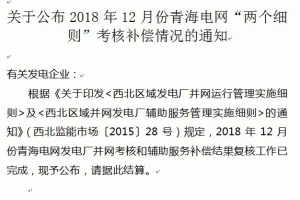 從西北監(jiān)管局官網(wǎng)獲悉,2018年12月份青海電網(wǎng)發(fā)電廠并網(wǎng)考核和輔助服務(wù)補償結(jié)果今日予以公布,具體情況如下: