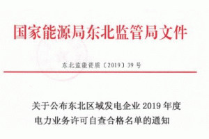 據(jù)東北監(jiān)管辦獲悉:今日(28日),國(guó)家能源局東北監(jiān)管辦印發(fā)《關(guān)于公布東北區(qū)域發(fā)電企業(yè)2019年度電力業(yè)務(wù)許可自查合格名單的通知》,公布了黑龍江,吉林,遼寧和內(nèi)蒙古東部地區(qū)2019年度電力業(yè)務(wù)許可自查合格名單。