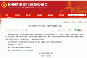 據(jù)陜西延安市發(fā)改委官網(wǎng)獲悉,根據(jù)延安市發(fā)改委日前發(fā)布的《關(guān)于廢止一批風(fēng)電、光伏項(xiàng)目的公示》,在梳理了該市風(fēng)電、光伏已核準(zhǔn)(備案)項(xiàng)目建設(shè)情況后,清理一批在核準(zhǔn)和備案期限內(nèi)未開工建設(shè)或企業(yè)自愿放棄建設(shè)的項(xiàng)目,包括風(fēng)電項(xiàng)目1個(gè),總規(guī)模50MW;光伏發(fā)電項(xiàng)目10個(gè),總規(guī)模251MW。廢止原因包括備案期內(nèi)未開