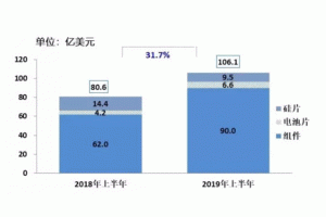 中國機(jī)電商會數(shù)據(jù)顯示, 2013年我國光伏組件出口規(guī)模約為19GW,2018年增加至44.8GW,年復(fù)合增長率達(dá)18.7%。2018年我國出口組件出口額137.49億美元,同比增長29.54%;出口量為44.8GW,同比大幅增長49.34%。根據(jù)CPIA數(shù)據(jù),2019年上半年光伏產(chǎn)品(硅片、電池片、組件)出口總額106.1億美元,同比增長31.7%。其中組件出口規(guī)模約為36GW,同比增長近一倍。