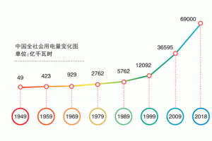 新中國成立初期,我國電力發(fā)展基礎(chǔ)薄弱。1949年,中國人均年發(fā)電裝機(jī)容量僅為3.4瓦,人均年用電量僅9千瓦時(shí)。70年來,中國電網(wǎng)實(shí)現(xiàn)了起飛、轉(zhuǎn)型到跨越的驚人巨變,如今,國家電網(wǎng)也已成為全球并網(wǎng)裝機(jī)規(guī)模最大、電壓等級最高、資源配置能力最強(qiáng)、安全水平最好的特大型電網(wǎng),為我國經(jīng)濟(jì)實(shí)現(xiàn)高速增長和人民生活水平持續(xù)改善作出了重要貢獻(xiàn)。