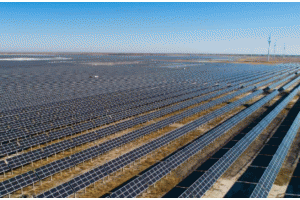 八百里瀚海的廣袤土地上,一片片泛著烏光的太陽能板,猶如散落的黑色珍珠,在莽莽草原中熠熠生輝。