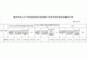 依據(jù)重慶市能源局《關(guān)于做好2019年度光伏發(fā)電項目建設(shè)管理有關(guān)工作的通知》(渝能源電〔2019〕39號)要求,現(xiàn)對重慶市納入2019年國家財政補貼規(guī)模的戶用光伏項目進行公示,具體見附件。