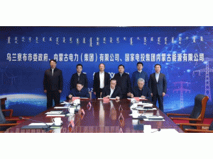國家電投內(nèi)蒙古公司(右)與烏蘭察布市(中)、內(nèi)蒙古電力(集團)有限責任公司(左)三方代表簽署合作協(xié)議