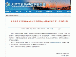 天津市發(fā)展和改革委員會(huì)發(fā)布關(guān)于征求《天津市2020年可再生能源電力消納實(shí)施方案》意見的公告,根據(jù)《國(guó)家發(fā)展改革委 國(guó)家能源局關(guān)于建立健全可再生能源電力消納保障機(jī)制的通知》(發(fā)改能源〔2019〕807號(hào))要求,為做好天津市可再生能源電力消納責(zé)任權(quán)重落實(shí)工作,現(xiàn)就《天津市2020年可再生能源電力消納實(shí)施方案》面向社會(huì)征求意見,征求意見時(shí)間為:2020年5月28日-6月5日。