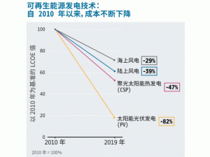 國際可再生能源署(IRENA)發(fā)布最新版可再生能源成本報告,指出受技術(shù)進(jìn)步、規(guī);(jīng)濟(jì)、供應(yīng)鏈競爭日益激烈和開發(fā)商經(jīng)驗(yàn)日益增長的推動,在過去10年間可再 生能源發(fā)電成本急劇下降。據(jù)IRENA在 2019 年從 17000個項(xiàng)目中收集的成本數(shù)據(jù)顯示,自2010 年以來太陽能光伏發(fā)電(PV)、聚光太陽能熱發(fā)電(CSP)、陸上風(fēng)電和海上風(fēng)電的成本分別下降了82%、47%、39% 和 29%。2019 年,在所有新近投產(chǎn)的并網(wǎng)大規(guī)?稍偕茉窗l(fā)電容量中,有56% 的成本都低于最便宜的化石燃料發(fā)電。
