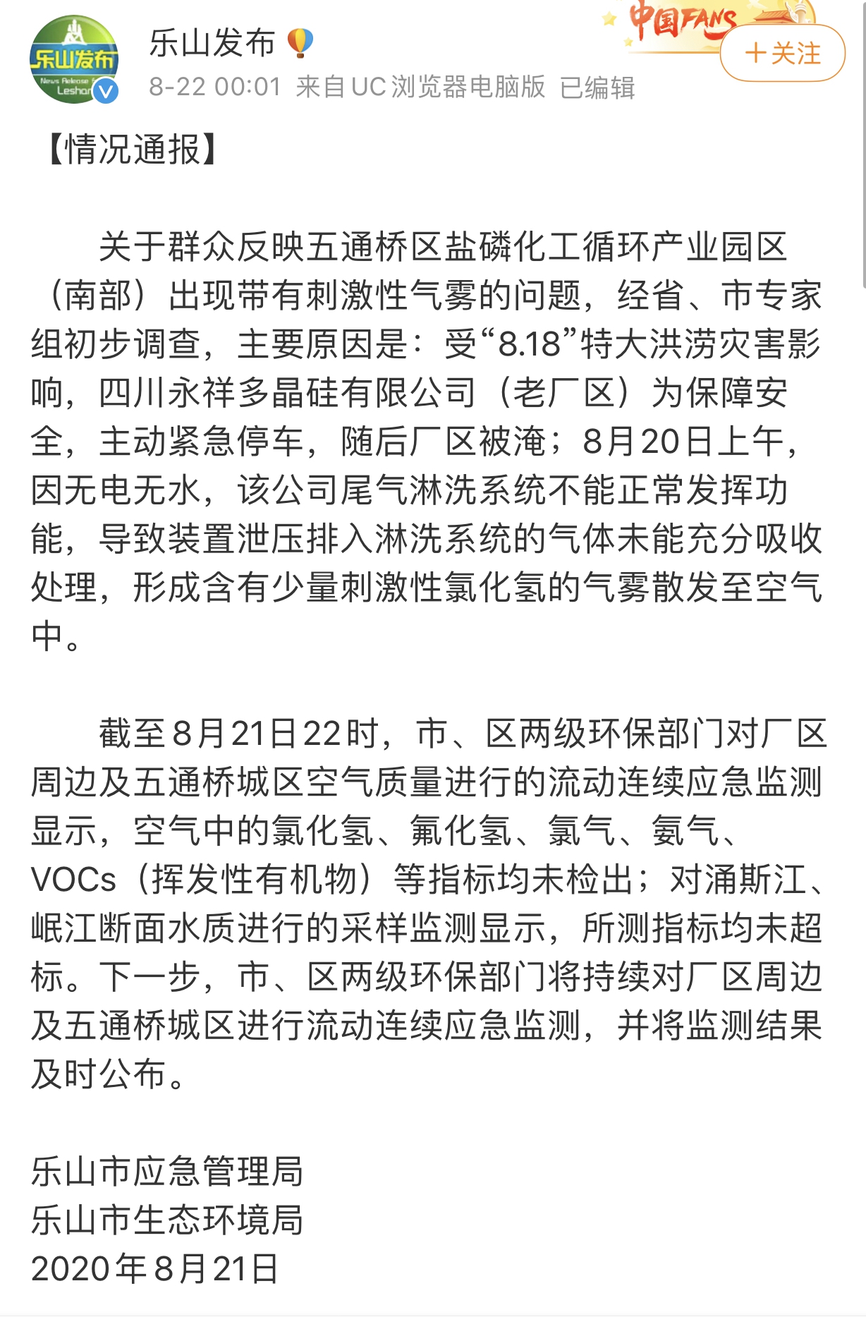 8月22日零時剛過,四川省樂山市應急管理局、樂山市生態(tài)環(huán)境局通過“樂山發(fā)布”微博公布近日“樂山刺激性濃霧”事件的情況通報,稱異味氣霧系當?shù)囟嗑Ч杵髽I(yè)受洪澇影響主動緊急停車后,尾氣處理系統(tǒng)無法正常運行,“形成含有少量刺激性氯化氫的氣霧”。