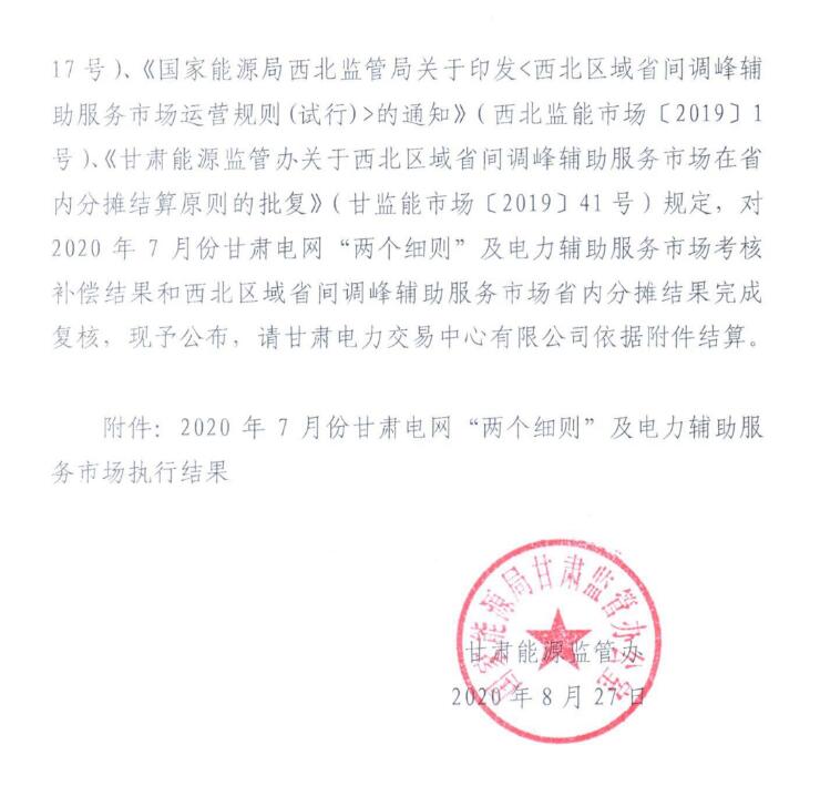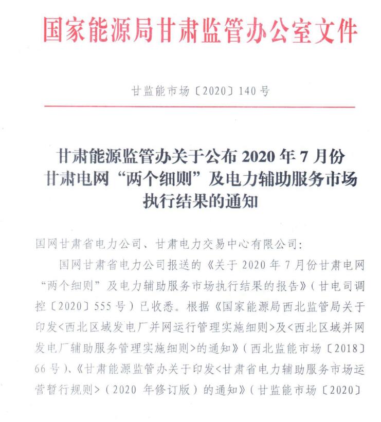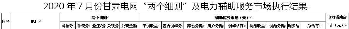 2020年7月份甘肅電網(wǎng)“兩個細(xì)則”及電力輔助服務(wù)市場執(zhí)行結(jié)果