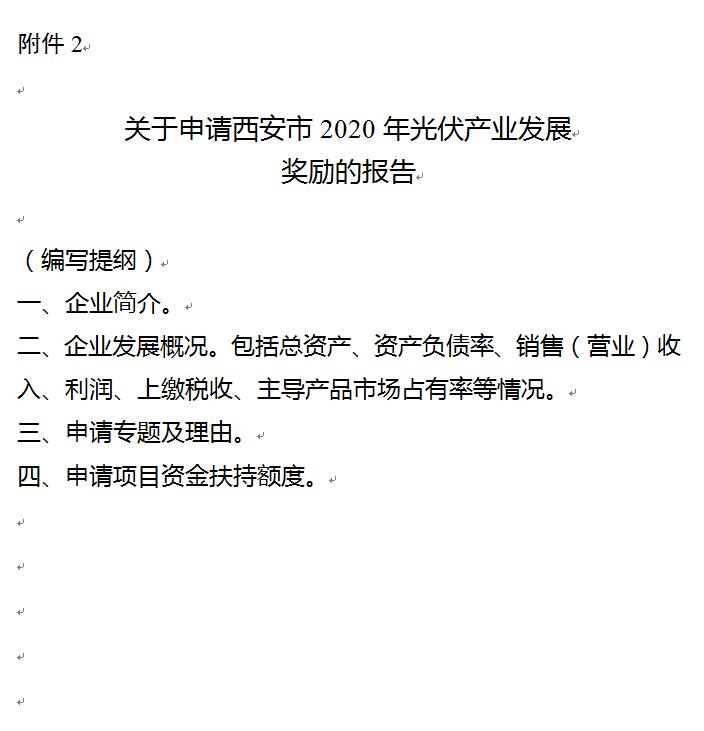 2.企業(yè)申請(qǐng)報(bào)告。申報(bào)企業(yè)以正式文件向市工信局、市財(cái)政局提交“關(guān)于申請(qǐng)西安市2020年光伏產(chǎn)業(yè)發(fā)展獎(jiǎng)勵(lì)的報(bào)告”(申請(qǐng)報(bào)告格式見附件2)。