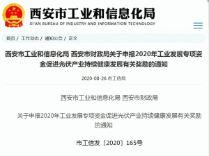 從西安市工信局官網(wǎng)獲悉:8月26日,西安市工業(yè)和信息化局 、西安市財(cái)政局聯(lián)合印發(fā)關(guān)于申報(bào)2020年工業(yè)發(fā)展專項(xiàng)資金促進(jìn)光伏產(chǎn)業(yè)持續(xù)健康發(fā)展有關(guān)獎(jiǎng)勵(lì)的通知,根據(jù)市政府《關(guān)于促進(jìn)光伏產(chǎn)業(yè)持續(xù)健康發(fā)展實(shí)施意見的通知》文件精神,決定組織開展2020年光伏產(chǎn)業(yè)發(fā)展獎(jiǎng)勵(lì)項(xiàng)目申報(bào)工作,對(duì)企業(yè)符合《光伏制造行