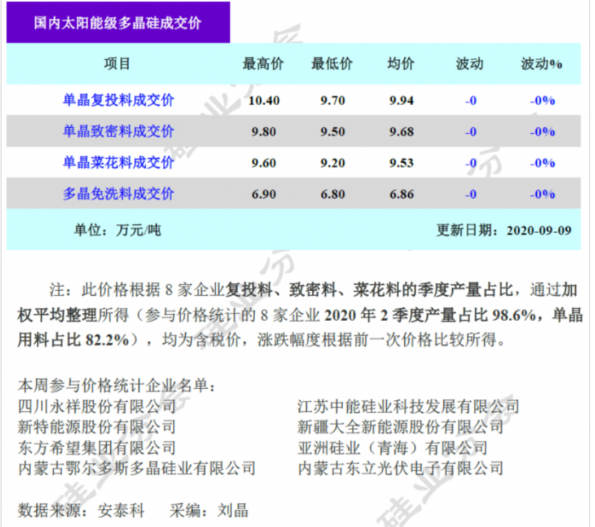 本周?chē)?guó)內(nèi)單晶復(fù)投料價(jià)格區(qū)間在9.7-10.4萬(wàn)元/噸,成交均價(jià)維持在9.94萬(wàn)元/噸;單晶致密料價(jià)格區(qū)間在9.5-9.8萬(wàn)元/噸,成交均價(jià)維持9.68萬(wàn)元/噸不變。本周多晶硅市場(chǎng)持穩(wěn)運(yùn)行,其中復(fù)投料、單晶致密料、單晶菜花料、多晶免洗料價(jià)格均持穩(wěn)不變。本周多晶硅成交價(jià)整體持穩(wěn),主要原因是:從市場(chǎng)實(shí)際供需看,根據(jù)9月份國(guó)內(nèi)多晶