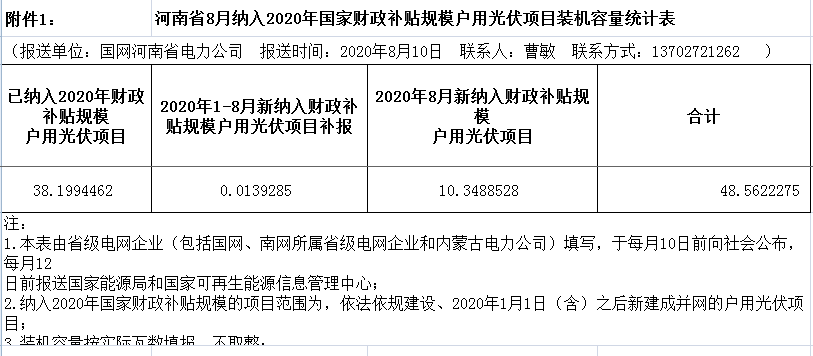 按照國家能源局相關(guān)要求,現(xiàn)對河南省2020年8月已建成并網(wǎng)但未納入國家補(bǔ)貼范圍的戶用光伏項(xiàng)目信息及2020年1-8月份并網(wǎng)戶用光伏變更信息予以公示。公示期為2020年9月10日-9月12日,如有異議,請?jiān)诠酒诮Y(jié)束前向國網(wǎng)河南省電力公司營銷部提出。聯(lián)系電話:0371-66895598附件1:河南省8月納入2020年國家財(cái)政補(bǔ)貼