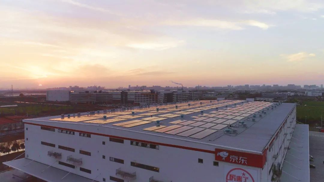 ▲京東物流上海亞一智能物流園區(qū)布局屋頂分布式光伏系統(tǒng)
