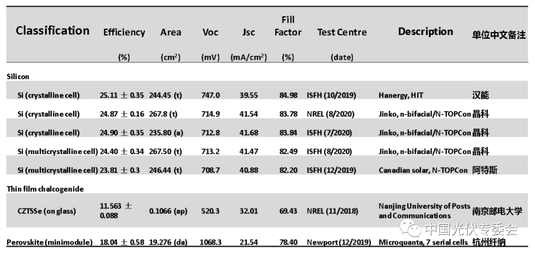 2020太陽電池中國最高效率表