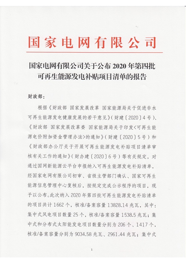 從國網(wǎng)新能源云獲悉:國家電網(wǎng)有限公司今日(9月30日)發(fā)布關(guān)于公布2020年第四批可再生能源發(fā)電補貼項目清單的公告。