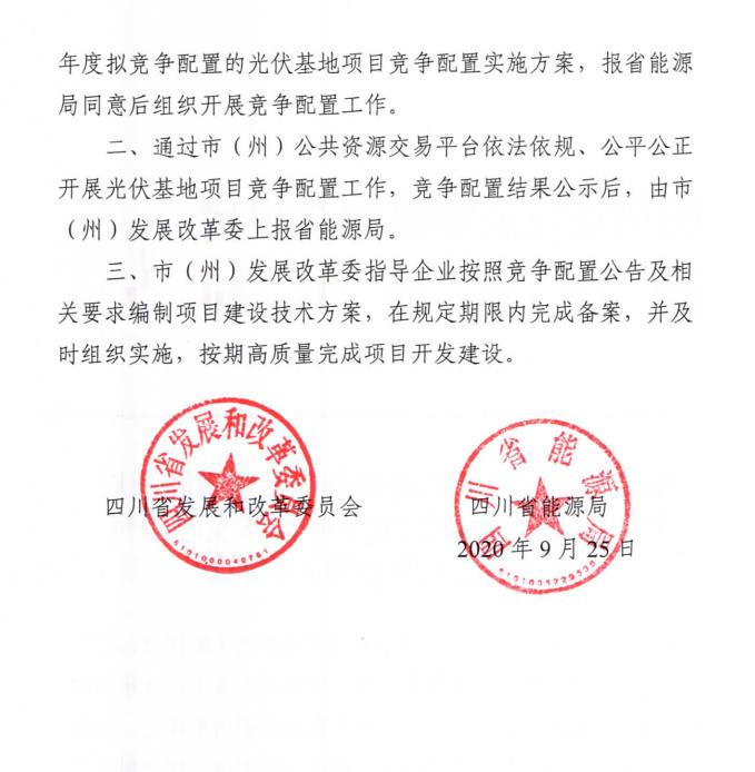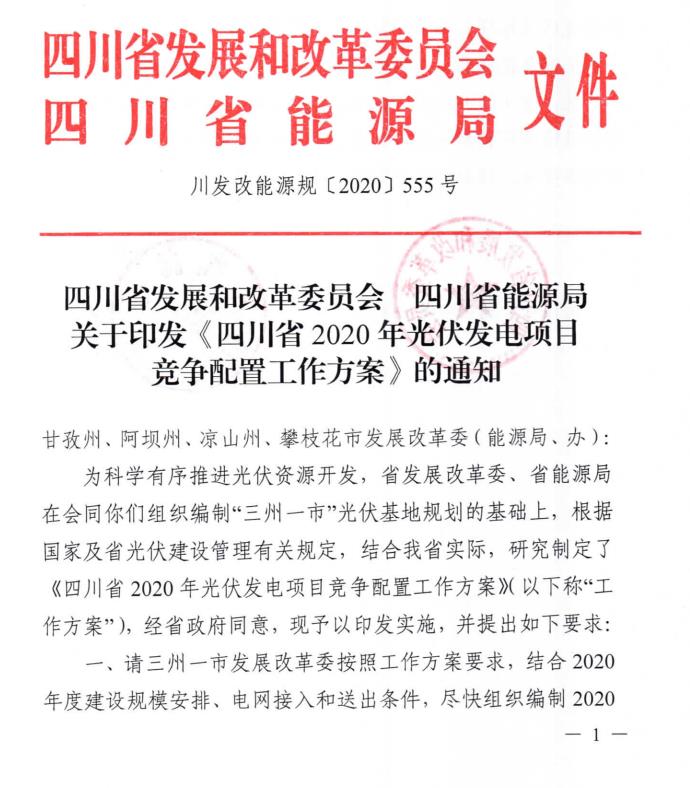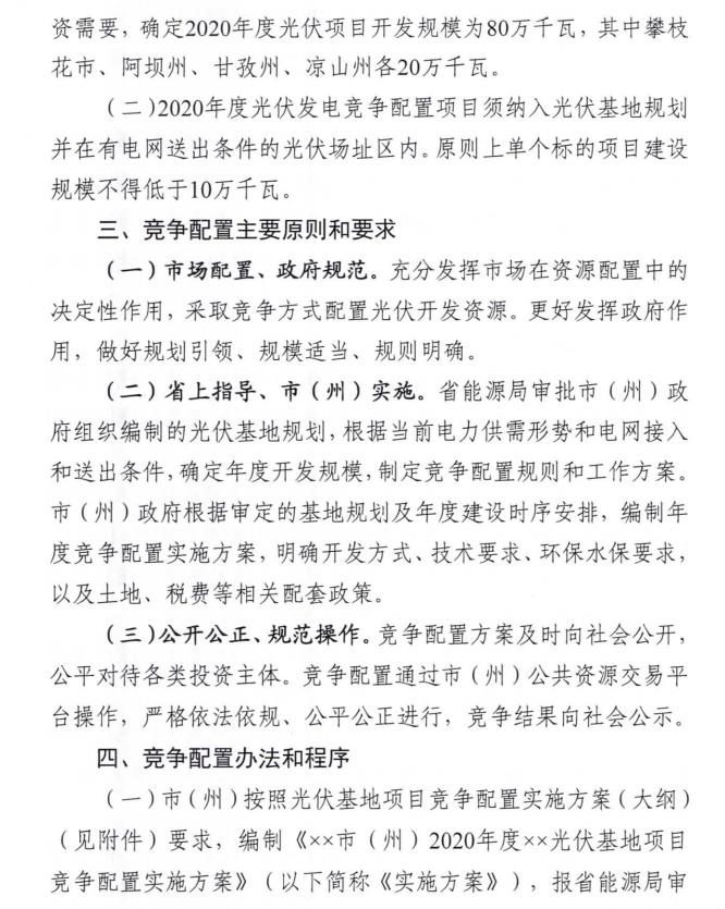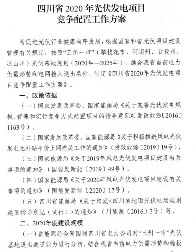四川省發(fā)改委和能源局在關(guān)于印發(fā)《四川省2020年光伏發(fā)電項(xiàng)目競(jìng)爭(zhēng)配置工作方案》的通知(川發(fā)改能源規(guī)〔2020〕555號(hào))中,要求三州一市發(fā)改委按照工作方案,結(jié)合2020年度建設(shè)規(guī)模安排、電網(wǎng)接入和送出條件,盡快組織編制2020擬競(jìng)爭(zhēng)配置的光伏基地項(xiàng)目競(jìng)爭(zhēng)配置方案。
