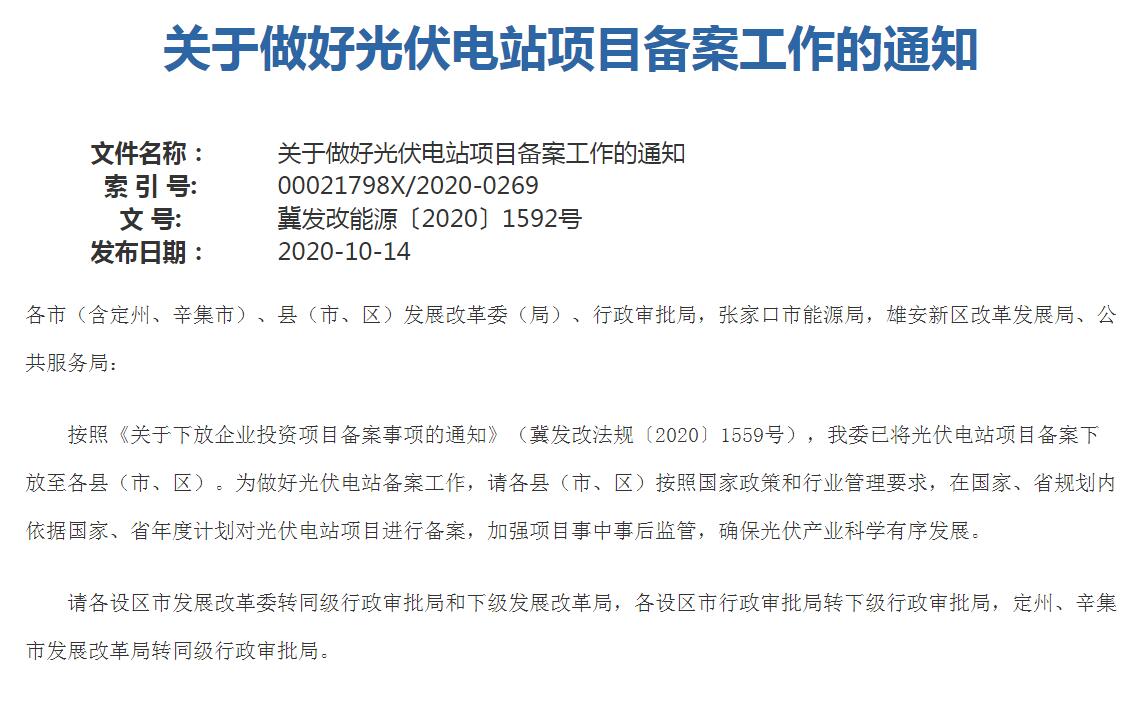 通知表示,按照《關于下放企業(yè)投資項目備案事項的通知》(冀發(fā)改法規(guī)〔2020〕1559號),我委已將光伏電站項目備案下放至各縣(市、區(qū))。請各設區(qū)市發(fā)展改革委轉(zhuǎn)同級行政審批局和下級發(fā)展改革局,各設區(qū)市行政審批局轉(zhuǎn)下級行政審批局,定州、辛集市發(fā)展改革局轉(zhuǎn)同級行政審批局。