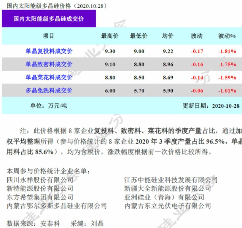 根據(jù)在產(chǎn)多晶硅企業(yè)生產(chǎn)計(jì)劃和檢修產(chǎn)線復(fù)產(chǎn)情況,預(yù)計(jì)11月份產(chǎn)量將環(huán)比繼續(xù)小幅增加,但同時硅片企業(yè)減產(chǎn)產(chǎn)能也將逐步恢復(fù)、擴(kuò)產(chǎn)進(jìn)度逐步推進(jìn)。在供需同步微增的情況下,預(yù)計(jì)短期內(nèi)硅料價格將繼續(xù)維持目前緩慢小幅下跌的走勢。