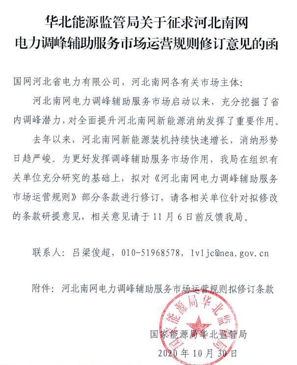 11月2日,華北能源監(jiān)管局印發(fā)關(guān)于征求河北南網(wǎng)電力調(diào)峰輔助服務(wù)市場運(yùn)營規(guī)則修訂意見的函,就擬修改條款征求意見。詳情如下: